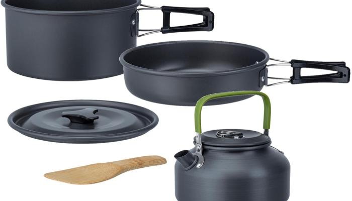Outdoor-Kochset aus eloxiertem Aluminium für 3/4 Personen. Klappbare Griffe mit wärmeisolierendem Silikon beschichtet. aus eloxiertem Aluminium klappbare Griffe für alle Herdarten geeignet (außer Induktion) Technische Daten: Gewicht: 1,2 kg Material: Aluminium Farbe: schwarz Lieferumfang: 1 kleiner Topf mit Deckel Ø 16,6 x 8,9 cm 1 Pfanne Ø 16,7 x 4,4 cm 1 Wasserkessel Ø 14,6 x 8,3 cm (1,1 L) 1 Bambuslöffel 1 Kocher Ständer Tragetasche