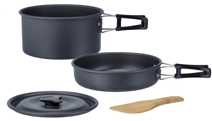 Outdoor-Kochset aus eloxiertem Aluminium für 3/4 Personen. Klappbare Griffe mit wärmeisolierendem Silikon beschichtet. aus eloxiertem Aluminium klappbare Griffe für alle Herdarten geeignet (außer Induktion) Technische Daten: Gewicht: 910 g Material: Aluminium Farbe: schwarz Lieferumfang: 1 Topf mit Deckel Ø 19 x 11,2 cm 1 kleiner Topf mit Deckel Ø 16,6 x 8,9 cm 1 Pfanne Ø 19,5 x 4,5 cm 1 Bambuslöffel 1 Kocher Ständer Tragetasche