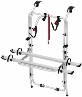 Praktisches Fahrradträgermodell zur Anbringung an Campingbussen. Die Halterungen zur Anbringung sind im Lieferumfang enthalten und ermöglichen ein sicheres Befestigen an den Heckklappe….