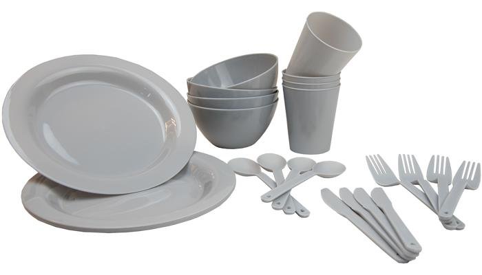 Formschönes und modernes Campinggeschirr. 24-teilig mit Teller, Schalen, Becher und Besteck. Aus robustem, spülmaschinengeeignetem Polypropylen. spülmaschinengeeignet Technische Daten: Gewicht: 400 g Material: 100% Polypropyen Farbe: grau Lieferumfang: 4 Teller 4 Schalen 4 Becher 4 Messer 4 Gabel 4 Löffel