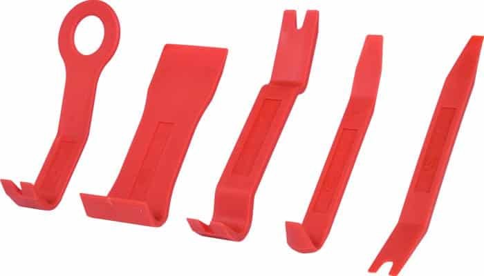 Kunststoffkeie ideal zum lackschonenden und beschädigungsfreien Lösen von Verkleidungsteilen, Zierleisten, usw. Praktische Zusammenstellung verschiedener Keil- und Hebelvarianten schlanke und robuste Ausführung für filigranes Arbeiten an leicht zerbrechlichen Kunststoffteilen Technische Daten: Material: Kunststoff Farbe: rot Gewicht: 300 g Lieferumfang: 5 Teile